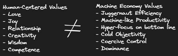 "Machine-like efficiency at all costs" is the prevailing value of our modern economy.